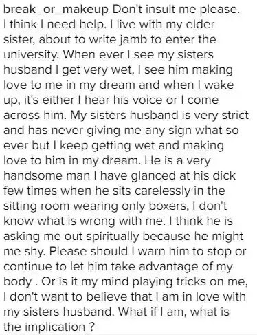 I Get Wet Any Time I See My Sister’s Husband, I Keep Having Hot S*x With Him In My Dream – Girl Makes Terrible Confession.